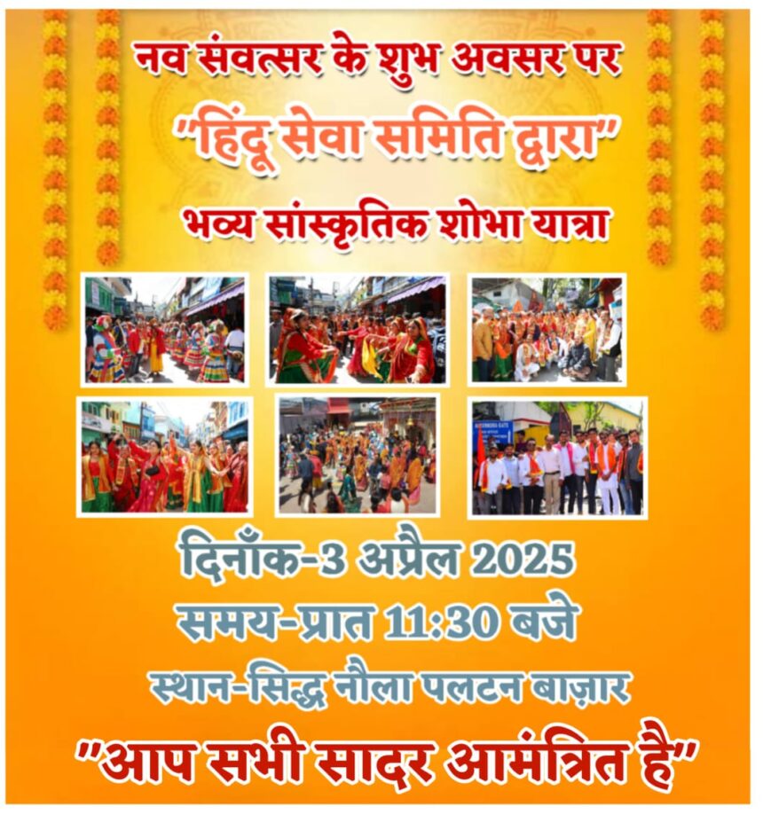अल्मोड़ा में हिंदू सेवा समिति द्वारा नव संवत्सर के पावन अवसर पर कल एक भव्य सांस्कृतिक शोभा यात्रा का आयोजन किया जाएगा। यह शोभा यात्रा सिद्ध नौले से सुबह 11 बजे प्रारंभ होगी और शहर के विभिन्न प्रमुख मार्गों से होती हुई अपने अंतिम गंतव्य तक पहुंचेगी।