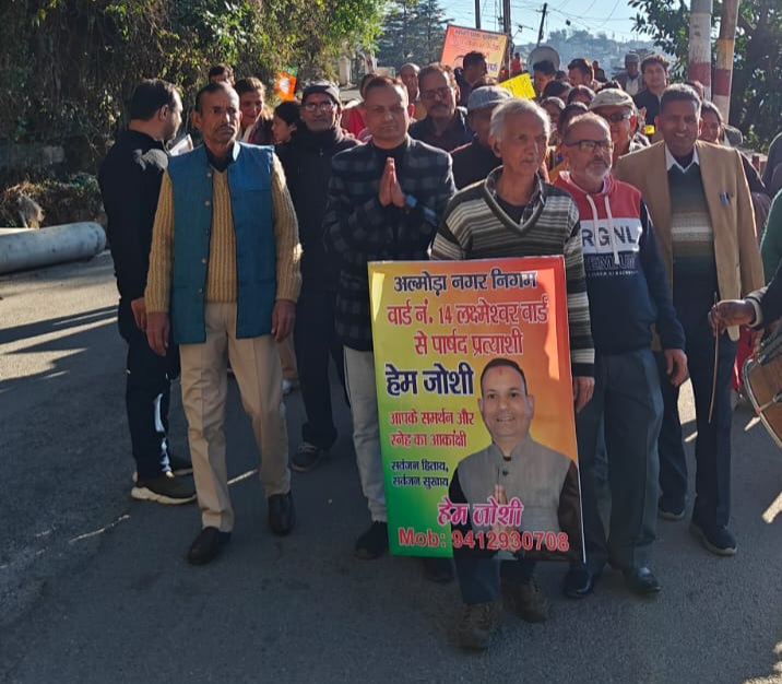वार्ड संख्या 14 लक्ष्मेश्वर से पार्षद प्रत्याशी हेम चन्द्र जोशी के समर्थन में एक विशाल रैली का आयोजन किया गया। यह रैली कर्नाटक खोला से शुरू होकर आईएसबीटी-चौसार-जाखनदेबी-लक्ष्मेश्वर तक निकाली गयी, और इसका उद्देश्य मतदाताओं को जागरूक करना था ताकि वे आगामी 23 जनवरी को ईमानदार, कर्मठ और समाजसेवी प्रत्याशी हेम चन्द्र जोशी के चुनाव चिन्ह “ईट” पर मुहर लगाकर उन्हें भारी मतों से विजयी बनाएं। रैली में क्षेत्र के नागरिकों ने बड़े उत्साह और समर्थन के साथ भाग लिया, जिससे यह आयोजन और भी प्रभावशाली हो गया।