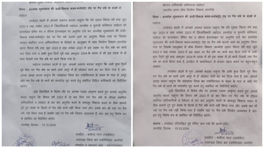 अल्मोड़ा में जिला बार एसोसिएशन के उपाध्यक्ष, एडवोकेट कवीन्द्र पन्त, ने हाल ही में लोक निर्माण विभाग के अधिशासी अभियन्ता और जिलाधिकारी से मुलाकात की। इस दौरान उन्होंने अल्मोड़ा की जजी-विकास भवन-कलेक्ट्रेट सड़क पर अधूरे पैच वर्क को तुरंत पूरा करने की मांग की। इस सड़क का हाल वर्तमान में अत्यंत खराब है, जिससे न केवल स्थानीय लोगों को, बल्कि विभिन्न सरकारी कार्यालयों में आने-जाने वालों को भी कठिनाइयों का सामना करना पड़ रहा है।