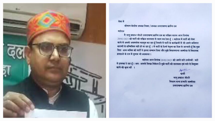 उत्तराखण्ड क्रान्ति दल के सक्रिय सदस्य भानु प्रकाश जोशी ने केंद्रीय अध्यक्ष को एक पत्र लिखकर पार्टी की सक्रिय सदस्यता से त्यागपत्र देने की घोषणा की है। उन्होंने पत्र में कहा कि वह 20 फरवरी 2025 को पार्टी की सक्रिय सदस्यता से त्यागपत्र दे रहे हैं। जोशी ने अपनी असमर्थता व्यक्त करते हुए कहा कि वह अब पार्टी की सेवा करने में सक्षम नहीं हैं, और इस कारण वह पार्टी के कार्यक्रमों में भी अपने व्यक्तिगत कारणों से भाग नहीं ले पा रहे हैं।