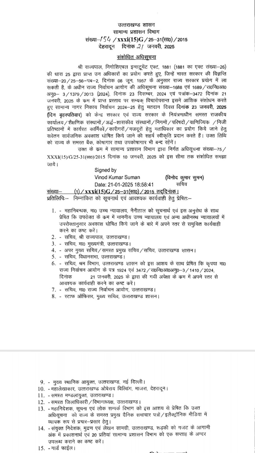उत्तराखंड में आगामी नगर निगम चुनाव को लेकर बड़ी खबर सामने आई है। राज्य सरकार ने 23 जनवरी 2024 को नगर निगम चुनाव के दिन सार्वजनिक अवकाश घोषित कर दिया है। यह निर्णय शहरवासियों और चुनाव कार्य में शामिल कर्मचारियों को वोट डालने और चुनाव प्रक्रिया में सक्रिय भागीदारी सुनिश्चित करने के उद्देश्य से लिया गया है।