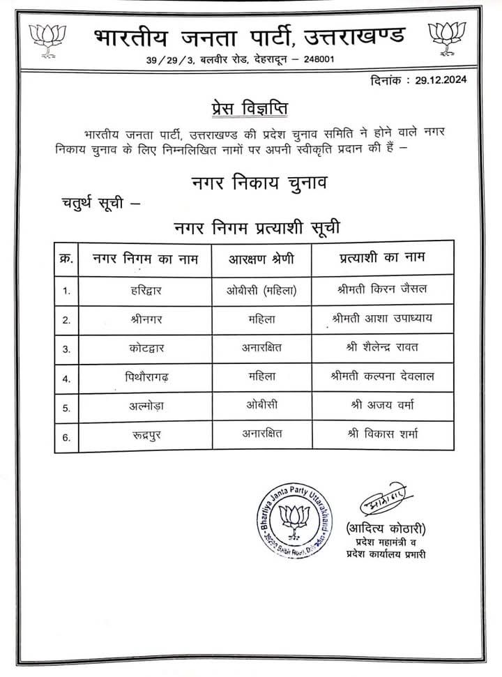 उत्तराखंड से जुड़ी खबर सामने आई है। उत्तराखंड में नगर निकाय चुनाव की तैयारियां चल रही है। भारतीय जनता पार्टी, उत्तराखण्ड की प्रदेश चुनाव समिति ने होने वाले नगर निकाय चुनाव के लिए निम्नलिखित नामों पर अपनी स्वीकृति प्रदान की हैं।