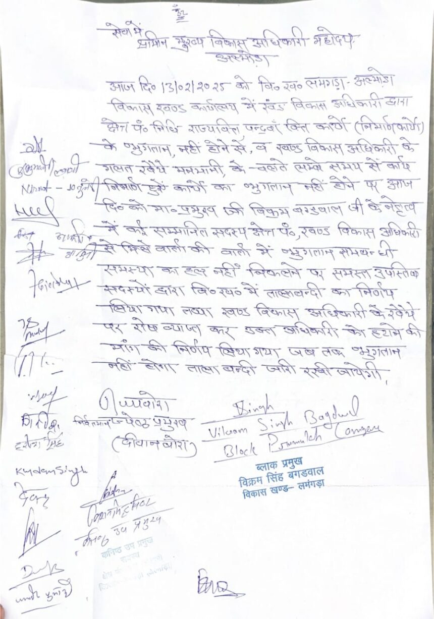 विकासखंड लमगड़ा, अल्मोड़ा के विकासखंड कार्यालय में आज एक महत्वपूर्ण घटना घटी, जब खंड विकास अधिकारी द्वारा क्षेत्र पंचायत निधि राज्य वित्त 15वें वित्त आयोग के तहत किए गए निर्माण कार्यों का भुगतान लंबे समय से नहीं किया गया। इस कारण से खंड विकास अधिकारी के मनमानी रवैये पर क्षेत्र पंचायत के सम्मानित सदस्यों ने विरोध जताया। प्रमुख विक्रम बगड़वाल के नेतृत्व में एक समूह ने खंड विकास अधिकारी से मिलकर इस समस्या पर वार्ता की, लेकिन जब भुगतान से संबंधित कोई हल नहीं निकला, तो सभी उपस्थित सदस्यों ने मिलकर कार्यालय में तालाबंदी करने का निर्णय लिया।