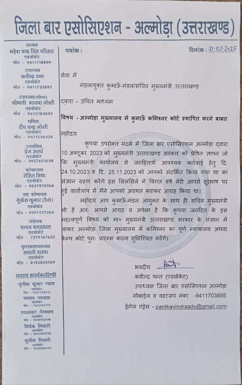 जिला बार एसोसिएशन अल्मोड़ा के उपाध्यक्ष, एडवोकेट कवीन्द्र पन्त ने कुमाऊँ-मंडल के मंडलायुक्त और सचिव मुख्यमंत्री उत्तराखण्ड, दीपक रावत को ज्ञापन भेजकर अल्मोड़ा जिला मुख्यालय में कुमाऊँ कमिश्नर कोर्ट स्थापित करने की मांग की है। उन्होंने बताया कि इस विषय में पहले भी 10 अक्टूबर 2023 को मुख्यमंत्री उत्तराखण्ड सरकार को ज्ञापन प्रेषित किया गया था, जिसे मुख्यमंत्री कार्यालय ने आवश्यक कार्रवाई हेतु 24 अक्टूबर 2023 और 25 नवम्बर 2023 को कुमाऊँ कमिश्नर को संदर्भित किया था।