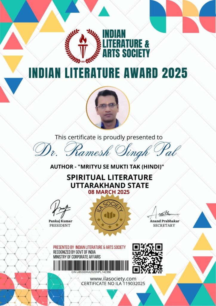 अल्मोड़ा: विवेकानंद पर्वतीय कृषि अनुसंधान संस्थान, अल्मोड़ा में कार्यरत वरिष्ठ वैज्ञानिक, डॉ. रमेश सिंह पाल को उनकी हाल ही में प्रकाशित पुस्तक “मृत्यु से मुक्ति तक” के लिए कॉर्पोरेट कार्य मंत्रालय, भारत सरकार से सम्बद्ध भारतीय साहित्य और कला सोसाइटी, बंगलूरू द्वारा प्रतिष्ठित भारतीय साहित्य पुरस्कार, 2025 से सम्मानित किया गया। यह पुरस्कार डॉ. पाल को उनकी साहित्यिक और आध्यात्मिक दृष्टि से किए गए योगदान के लिए प्रदान किया गया।