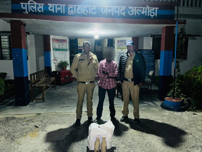 पुलिस ने आरोपी के पास से 2 बोतल अंग्रेजी शराब (ब्लेंडर प्राइड मार्का) और 12 बोतल देशी मसालेदार शराब (गुलाब माल्टा मार्का) अवैध रूप से बरामद की। इसके बाद आरोपी को गिरफ्तार कर थाना द्वाराहाट में आबकारी अधिनियम के तहत एफआईआर पंजीकृत कर आवश्यक कानूनी कार्यवाही की गई।