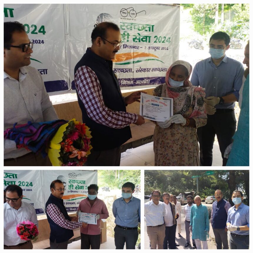 अल्मोड़ा – मा0 मुख्यमंत्री के निर्देशानुसार स्वच्छता ही सेवा कार्यक्रम के तहत एनटीडी स्थित नौले के आज पास के क्षेत्र में नगर निगम अल्मोड़ा द्वारा स्वच्छता कार्यक्रम का आयोजन किया गया। इस दौरान जिलाधिकारी आलोक कुमार पांडेय, मुख्य विकास अधिकारी दिवेश शाशनी एवं अन्य अधिकारियों एवं जनप्रतिनिधियों ने इस कार्यक्रम में प्रतिभाग कर साफ सफाई की तथा लोगों में स्वच्छता के प्रति जागरूकता लाने का प्रयास किया। इस दौरान जिलाधिकारी ने कहा कि स्वच्छता हमे सभ्य होने का प्रमाण देती है। हमें अपने आस पास साफ सफाई का ध्यान रखना चाहिए। इस दौरान जिलाधिकारी ने बेहतर कार्य करने वाले पर्यावरण मित्रों को शॉल ओढ़ाकर तथा प्रशस्ति पत्र देकर सम्मानित भी किया।