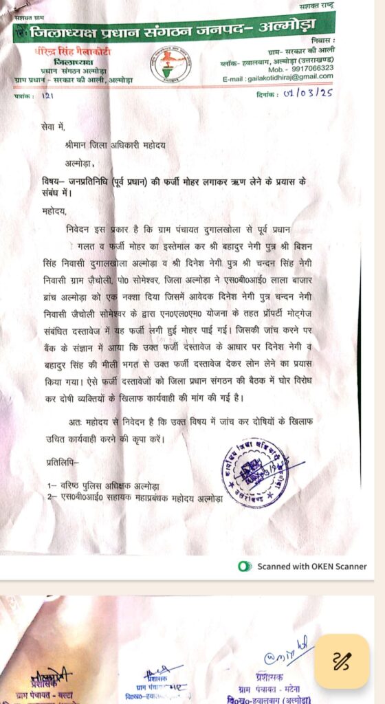 अल्मोड़ा जिले में जिलाध्यक्ष धीरेन्द्र सिंह गैलाकोटी प्रधान संगठन द्वारा एक ज्ञापन जिला अधिकारी को सौंपा गया, जिसमें एक गंभीर धोखाधड़ी के प्रयास की जांच की मांग की गई। ज्ञापन में बताया गया कि ग्राम पंचायत दुगालखोला की पूर्व प्रधान की फर्जी मोहर का इस्तेमाल कर ऋण लेने का प्रयास किया गया।
