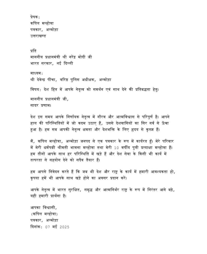 देश में मौजूदा हालातों के बीच प्रधानमंत्री नरेंद्र मोदी के नेतृत्व में लिए गए निर्णयों से देशवासियों में राष्ट्र गौरव और आत्मविश्वास की लहर है। इसी क्रम में अल्मोड़ा जनपद के पत्रकार कपिल मल्होत्रा ने प्रधानमंत्री को एक भावुक पत्र प्रेषित कर उनके नेतृत्व को समर्थन देने और देश सेवा में हरसंभव सहयोग देने की प्रतिबद्धता जताई है।