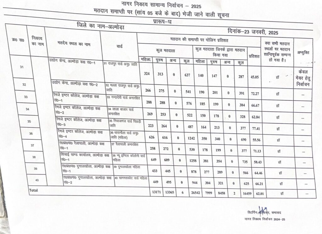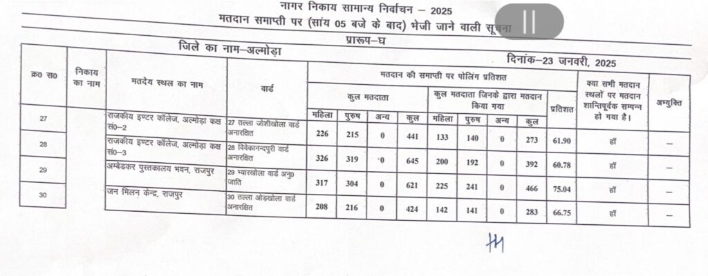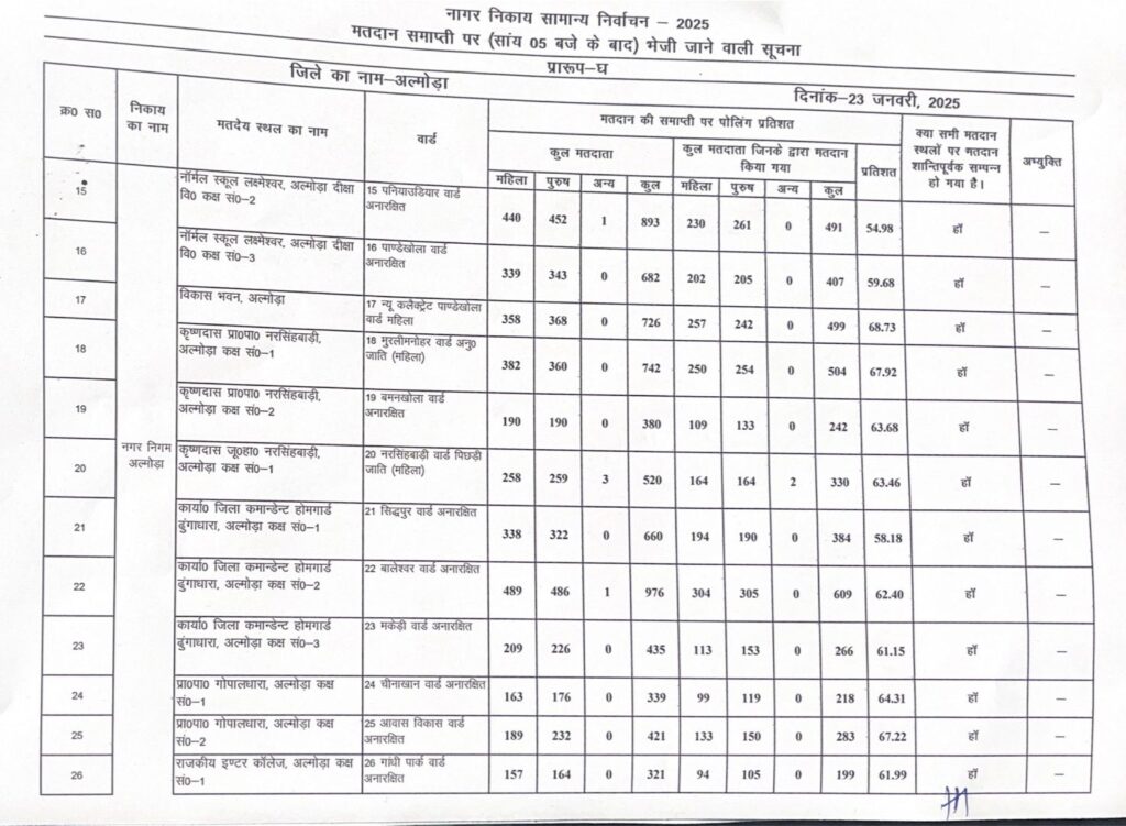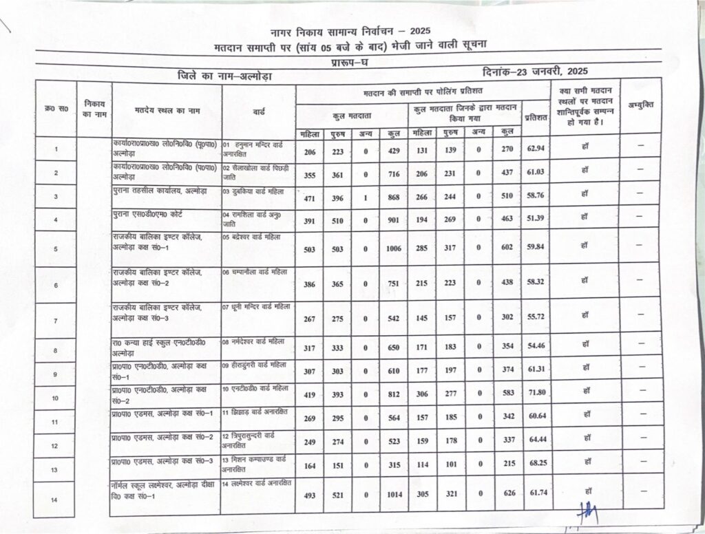 अल्मोड़ाउत्तराखण्डचुनाव आइए जानते हैं अल्मोड़ा नगर निगम चुनाव में किस वार्ड में कितने पड़े वोट Last updated: January 24, 2025 3:34 pm कपिल मल्होत्रा 11 months ago Share SHARE अल्मोड़ा नगर निगम चुनाव में टोटल 61.99% वोट पड़े जिसमें किस वार्ड में कितने वोट पड़े देखिए। Share This Article Facebook Whatsapp Whatsapp Telegram Print Previous Article अल्मोड़ा नगर निगम का मतदान 61.99 प्रतिशत रहा Next Article मेयर चुनाव को लेकर के राष्ट्र नीति संगठन ने चुनाव आयोग को लिखा शिकायती पत्र Leave a Comment Leave a Comment Leave a Reply Cancel replyYour email address will not be published. Required fields are marked *Comment * Name * Email * Website Save my name, email, and website in this browser for the next time I comment. SearchSearch - Advertisement - Recent Postsउत्तराखंड राज्य जुजित्सु प्रतियोगिता 2025 में अल्मोड़ा के 14 खिलाड़ी करेंगे प्रतिभा का प्रदर्शन अल्मोड़ा में रेड टेप शोरूम का भव्य उद्घाटन जिला बार एसोसिएशन अल्मोड़ा के द्विवार्षिक चुनाव में नामांकन प्रक्रिया शुरू लगातार बाघ के बढ़ते आतंक को लेकर पार्षद आशा बिष्ट ने वन विभाग के साथ क्षेत्र में किया दौरा जन समस्याओं के समाधान को लेकर पार्षदों ने खोला मोर्चा Recent Comments