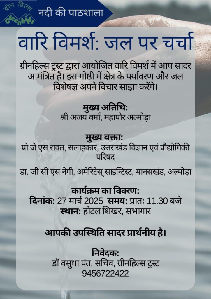 अल्मोड़ा : पहाड़ों पर सूखती नदियों, घटते जल स्रोतों, गिरते भू-जल स्तर और गिरती जल गुणवत्ता पर ग्रीन हिल्स ट्रस्ट और गंगा सुरक्षा समिति द्वारा एक महत्वपूर्ण विमर्श गोष्ठी ‘वारि विमर्श: जल पर चर्चा’ का आयोजन किया जा रहा है। इस गोष्ठी का संरक्षण डा. वसुधा पन्त द्वारा किया जाएगा। यह गोष्ठी 2023 में संपन्न की गई ‘पर्यावरणीय जल यात्रा’ के निरंतर उपक्रम के रूप में आयोजित हो रही है। कार्यक्रम का आयोजन 27 मार्च 2025 को, गुरूवार को, प्रातः 11:30 बजे से होटल शिखर के सभागार में किया जाएगा। इस अवसर पर स्वाल नदी यात्रा के उपरांत आयोजित एक पुस्तक का अनावरण भी किया जाएगा। यह पुस्तक “स्वाल: अ स्प्रिचुअल वॉयेज: अ सोलफुल एंड साइंटिफिक इंटरवेंशन इन रिवर्स रेजुविनेशन” नदी के वैज्ञानिक शोध और इसके अध्यात्मिक एवं पर्यावरणीय पहलुओं को दर्शाती है।