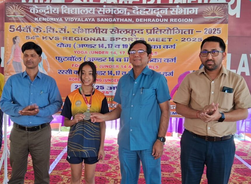 राजधानी देहरादून स्थित पी.एम.श्री केंद्रीय विद्यालय में आयोजित 54वीं संभागीय खेलकूद प्रतियोगिता के अंतर्गत योग प्रतियोगिता में अल्मोड़ा की नव्या भाकुनी ने शानदार प्रदर्शन कर रजत पदक (सिल्वर मेडल) जीतकर क्षेत्र का नाम रोशन किया है। अंडर-14 बालिका वर्ग में नव्या ने अपने उत्कृष्ट योग कौशल का परिचय देते हुए निर्णायकों का दिल जीता और अब वह राष्ट्रीय स्तर (नेशनल्स) की प्रतियोगिता में प्रतिभाग करेंगी।