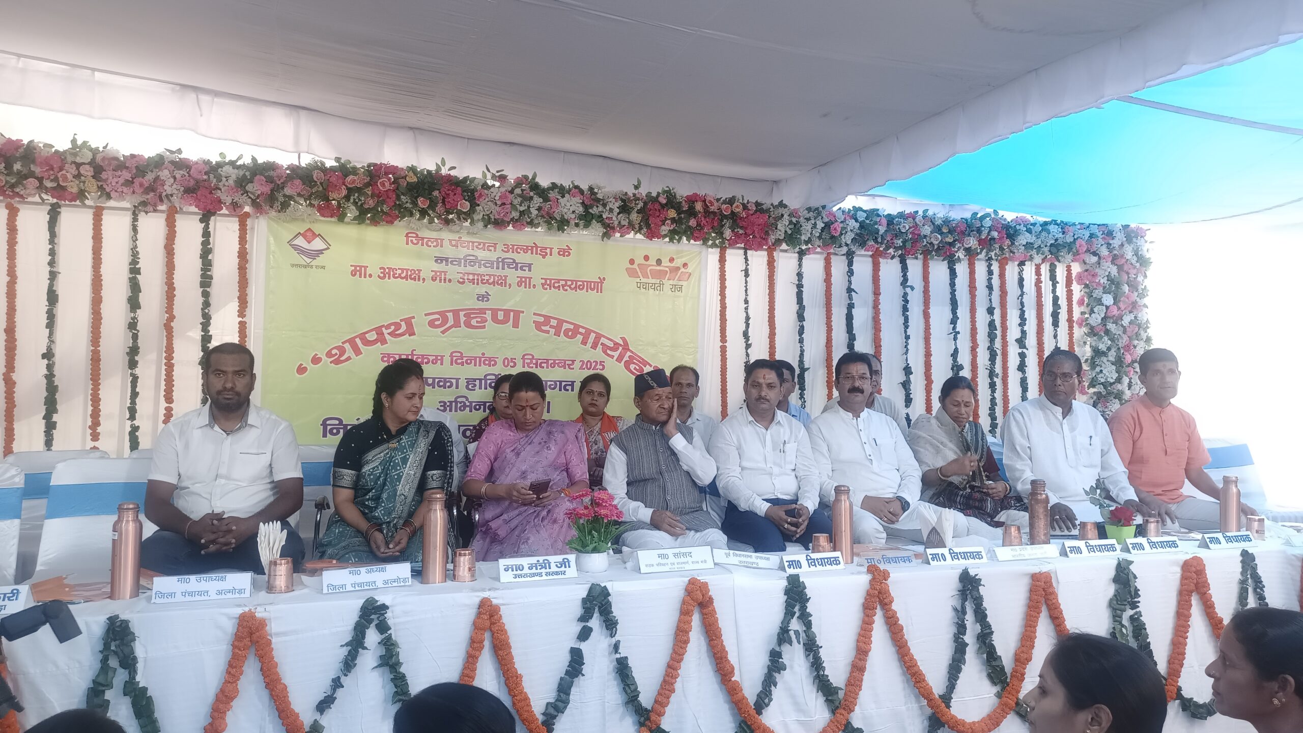 Almora. The swearing-in ceremony of the newly elected District Panchayat Chairperson, Vice-Chairperson, and members was held with great enthusiasm and dignity at the District Panchayat office on Friday. The event was presided over by State Cabinet Minister Rekha Arya, who attended as the chief guest. The ceremony witnessed the presence of several public representatives, officials, and distinguished citizens from across the district.