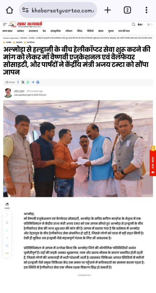 इस महत्वपूर्ण उपलब्धि की शुरुआत 5 अप्रैल 2025 को हुई थी, जब माँ वैष्णवी एजुकेशन एवं वेलफेयर सोसाइटी के सचिव कपिल मल्होत्रा, पार्षद अमित साह मोनू, पार्षद अभिषेक जोशी, पार्षद अर्जुन सिंह बिष्ट एवं पार्षद ज्योति साह, नगर अध्यक्ष भाजपा विनीत बिष्ट के साथ एक प्रतिनिधिमंडल ने मुख्यमंत्री को औपचारिक ज्ञापन सौंपा था। इस ज्ञापन में अल्मोड़ा जैसे पर्वतीय क्षेत्र के लिए हेलीकॉप्टर सेवा की आवश्यकता को स्पष्ट रूप से प्रस्तुत किया गया था।