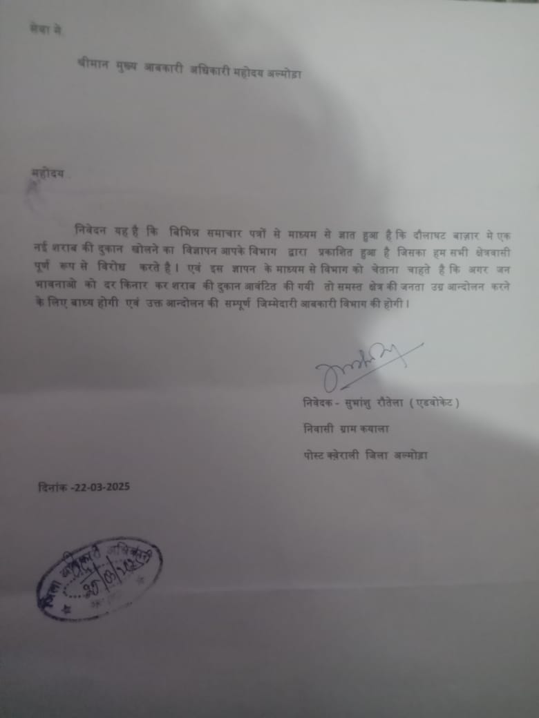 दौलघट में प्रस्तावित शराब ठेके के विरोध में क्षेत्रीय जनता ने आबकारी अधिकारी को ज्ञापन सौंपा। ज्ञापन में चेतावनी दी गई कि जनभावनाओं के खिलाफ यदि शराब ठेके का आवंटन किया गया, तो क्षेत्र की जनता इसे लेकर उग्र आंदोलन शुरू करेगी। ज्ञापन में यह भी कहा गया कि 23 मार्च से क्षेत्र में हस्ताक्षर अभियान चलाया जाएगा, जिसके माध्यम से प्रस्तावित ठेके के विरोध में जनभावनाओं को एकत्र किया जाएगा। यह अभियान क्षेत्र की समस्त ग्राम सभाओं में चलाया जाएगा, ताकि जनसहयोग से ठेके के विरोध में एकजुट होकर प्रभावी कदम उठाया जा सके। स्थानीय लोगों ने अपने क्षेत्र को शराब के नशे से बचाने और समाज को सुरक्षित रखने के लिए यह अभियान शुरू किया है।