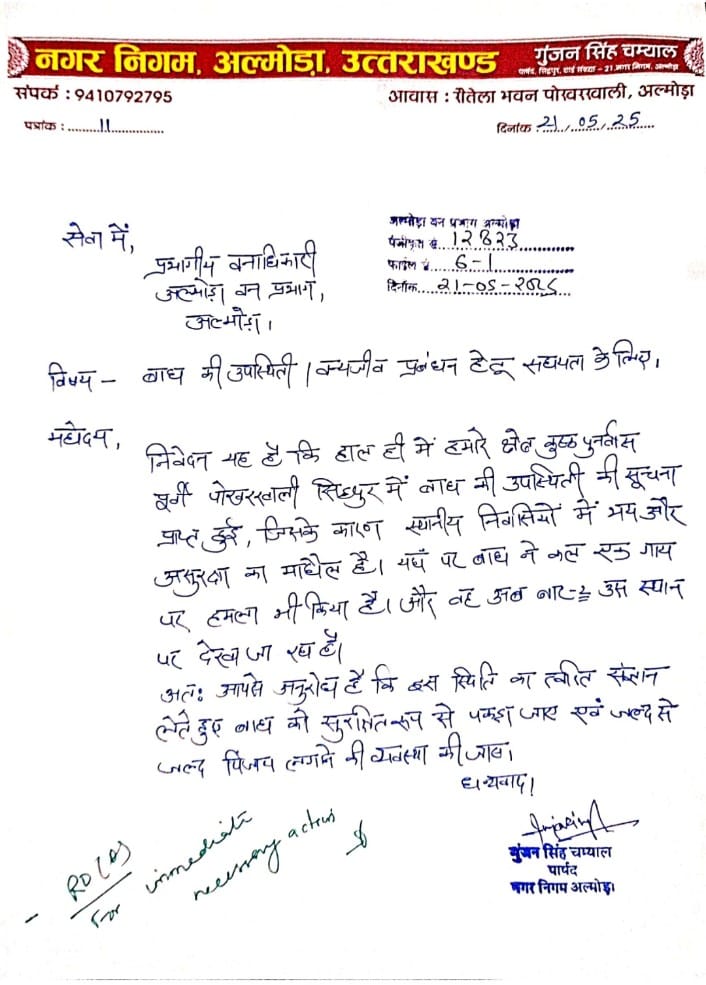 अल्मोड़ा: नगर निगम अल्मोड़ा के सिद्धपुर क्षेत्र में बाघ की सक्रियता से स्थानीय नागरिकों में भय और असुरक्षा का माहौल व्याप्त हो गया है। क्षेत्रीय पार्षद गुंजन सिंह चम्याल ने इस गंभीर स्थिति को देखते हुए प्रभारी वनाधिकारी, अल्मोड़ा वन प्रभाग को एक औपचारिक पत्र भेजकर वन्यजीव प्रबंधन के तहत त्वरित सहायता प्रदान करने की मांग की है।