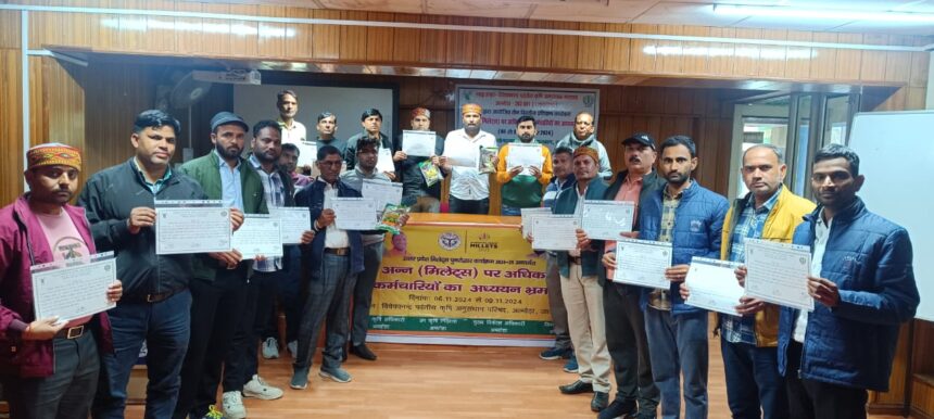 भाकृअनुप – विवेकानन्द पर्वतीय कृषि अनुसंधान संस्थान, अल्मोड़ा के प्रयोगात्मक प्रक्षेत्र, हवालबाग में 06 से 08 नवम्बर 2024 तक “श्री अन्न (मिलेट्स) पर अधिकारी/कर्मचारियों का अध्ययन भ्रमण” विषय पर तीन दिवसीय प्रशिक्षण कार्यक्रम का आयोजन किया गया। यह कार्यक्रम मिलेट्स पुनरोद्धार कार्यक्रम के तहत वित्तीय वर्ष 2024-25 में उप कृषि निदेशक कार्यालय, अमरोहा (उत्तर प्रदेश) द्वारा प्रायोजित किया गया। इसका मुख्य उद्देश्य अधिकारी और कर्मचारियों को श्री अन्न (मिलेट्स) की उन्नत तकनीकों से परिचित कराना था।