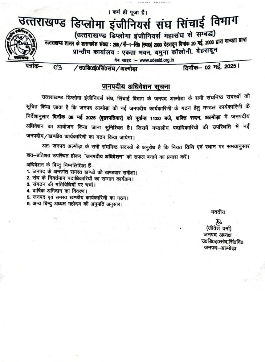 अल्मोड़ा। उत्तराखंड डिप्लोमा इंजीनियर्स संघ, सिंचाई विभाग, जनपद अल्मोड़ा के सभी संघनिष्ठ सदस्यों को सूचित किया जाता है कि नई जनपदीय कार्यकारिणी के गठन हेतु मण्डल कार्यकारिणी के निर्देशानुसार 08 मई 2025 (बृहस्पतिवार) को प्रातः 11:00 बजे, शक्ति सदन, अल्मोड़ा में जनपदीय अधिवेशन का आयोजन सुनिश्चित किया गया है।